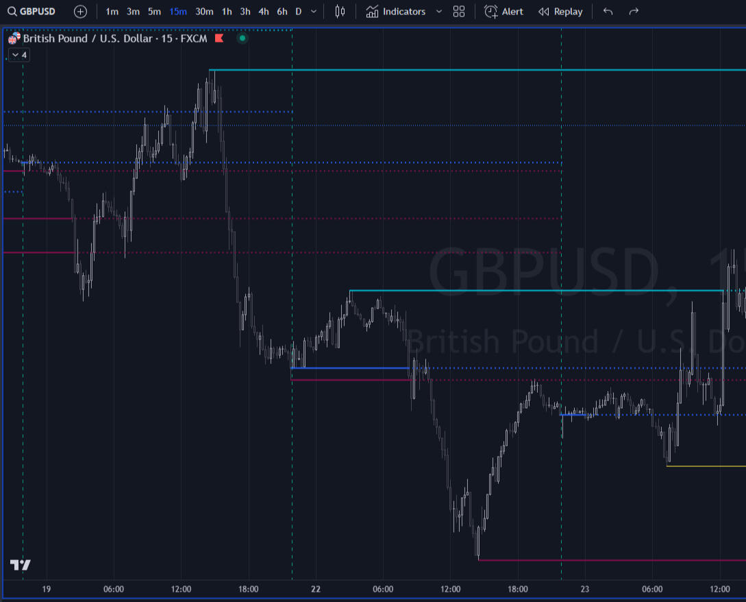Simplify tracking the day’s highs and lows. Real-time lines auto-adjust with new highs/lows, keeping key levels visible. Retain previous levels for trend analysis. Customize line colors and extend broken lines for better trade management. Compatible with 5- and 15-minute time frames.